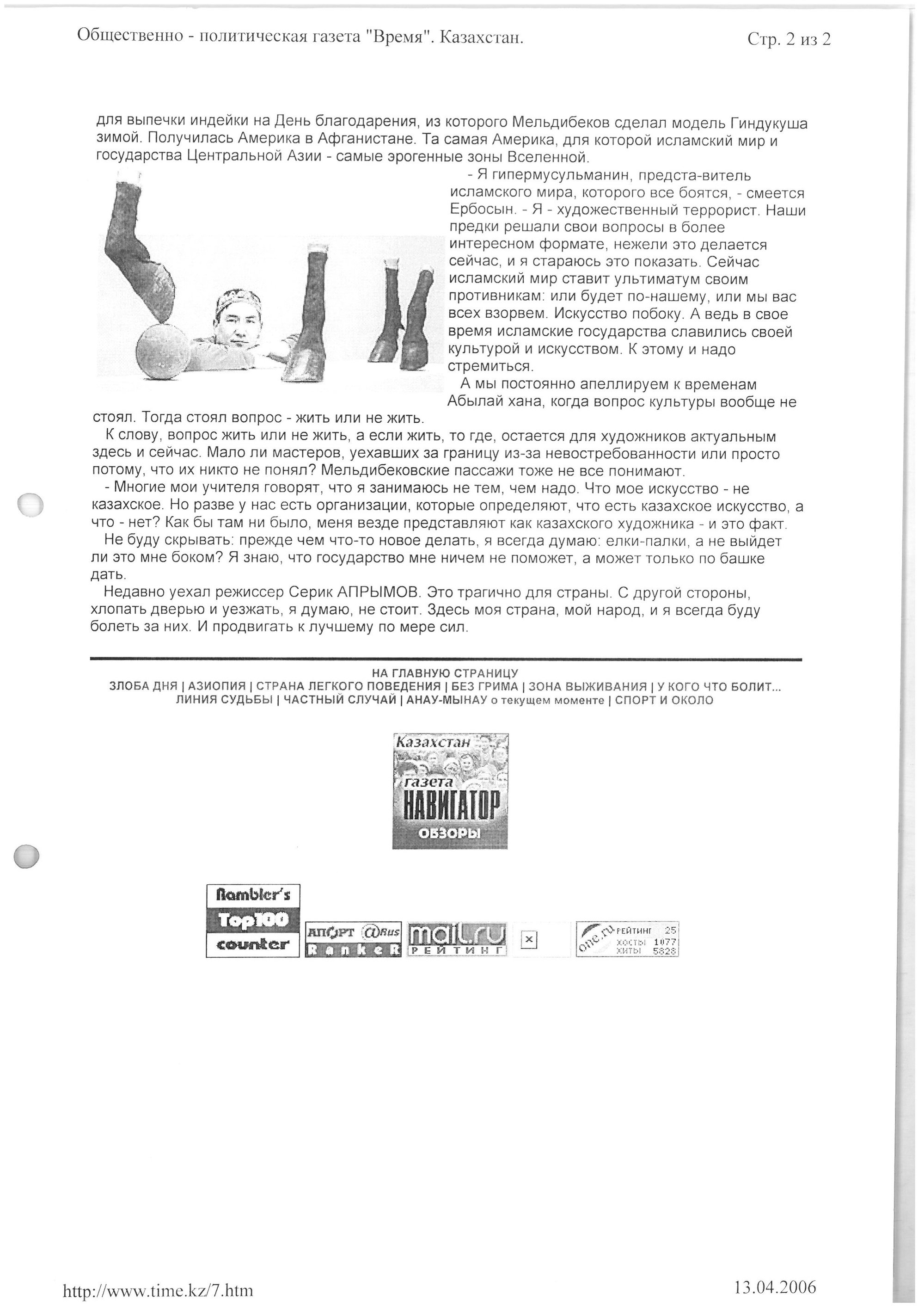 Менің көп ұстазым дұрыс емес іспен айналысып жүргенімді айтады. Менің өнерімнің қазақы еместігін алға тартады. Бірақ бізде ненің қазақы өнер, ал ненің қазақы өнер еместігін айқындайтын ұйымдар бар ма? Қайткен күнде, мені барлық жерде қазақ суретшісі деп таныстыратыны даусыз.