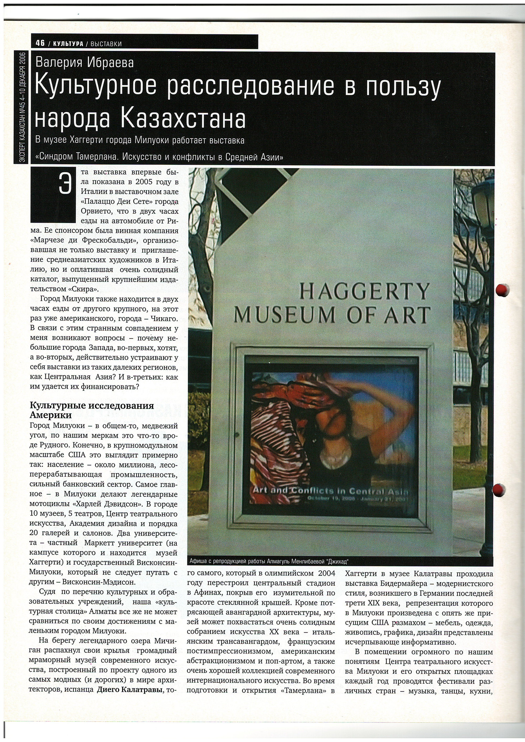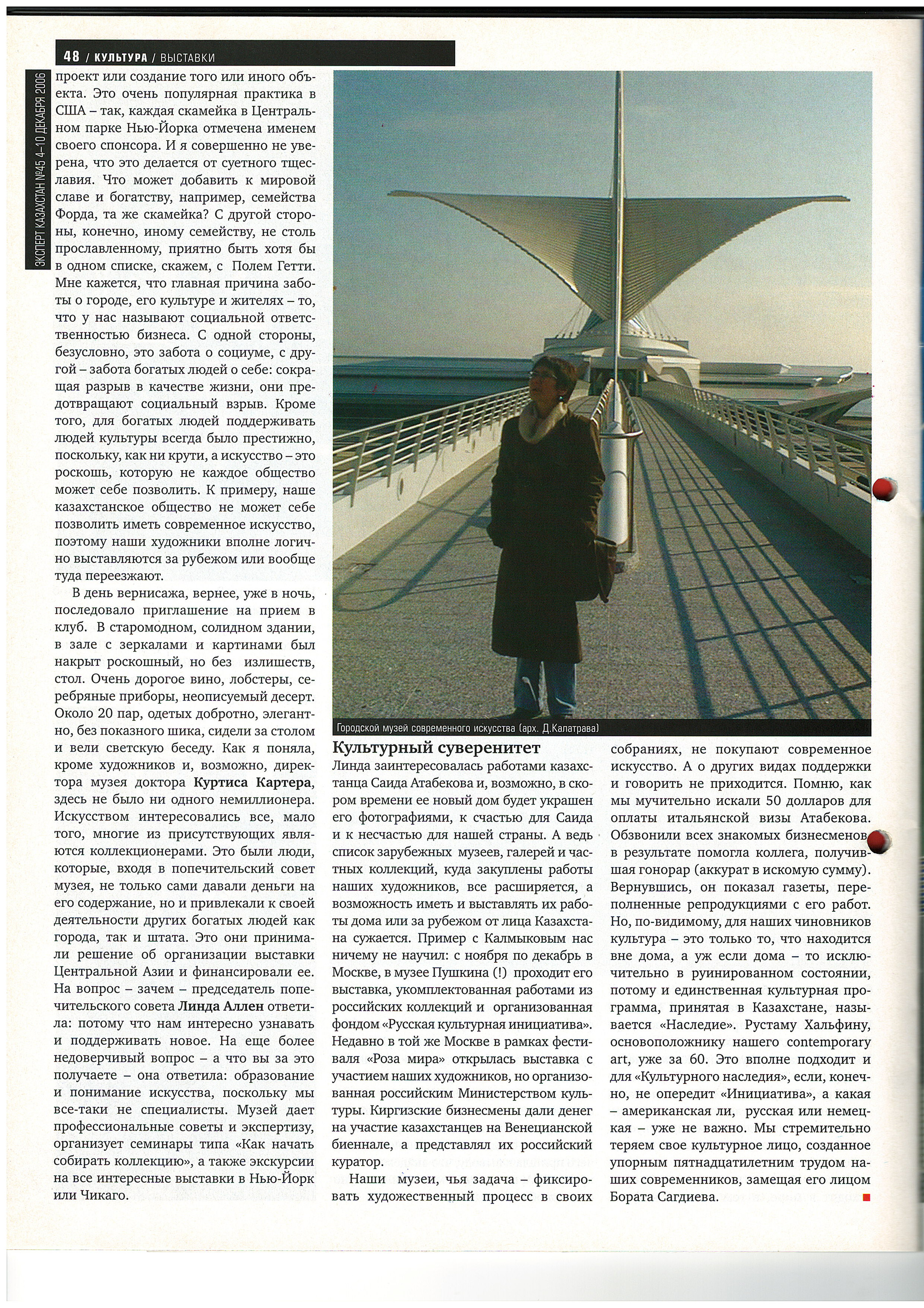 ... Қазақстанда қабылданған жалғыз мәдени бағдарлама “Мұра” деп аталады. Біздің заманауи өнердің негізін қалаған Рустам Халфин алпыстан асып кетті. Бұл “Мәдени мұра” үшін өте қолайлы, егер әлбетте “Инициатива-ны” басып озбаса, америкалық па, ресейлік пе, әлде немістікі ме - ол маңызды емес. Біз замандастарымыздың он бес жылдық табанды еңбегімен жасалған мәдени болмысымызды тез жоғалтып жатырмыз…