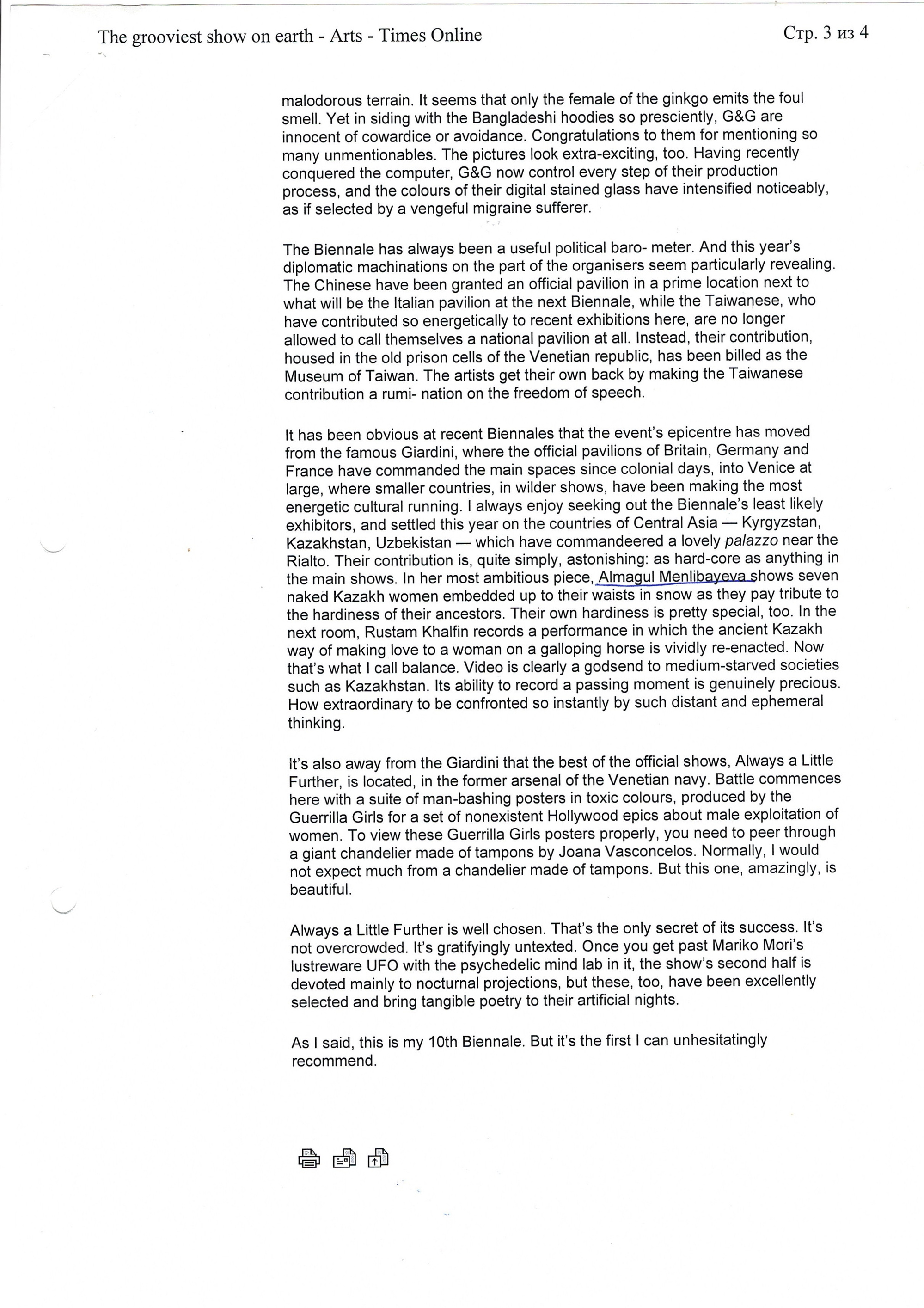 Их вклад просто поразителен: так же значим, как и вклад основных перформансов. В своей самой амбициозной работе Алмагуль Менлибаева показывает семь обнаженных казахских женщин, утопающих по пояс в снегу, они будто воздают должное памяти о выносливости своих предков. Их собственная выносливость тоже весьма впечатляет.